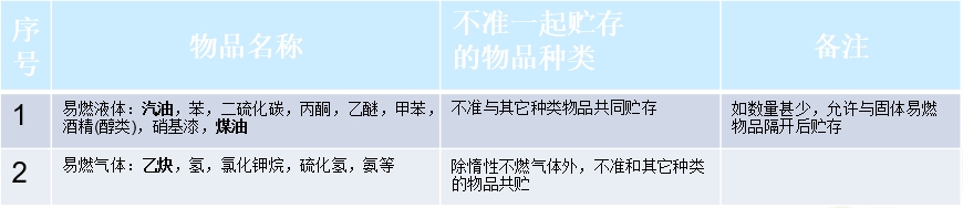 1、危險(xiǎn)化學(xué)品應(yīng)采用分類、分區(qū),分庫(kù)貯存;嚴(yán)禁將自身能形成爆炸性的物質(zhì),以及相互接觸或混合后能引起爆炸或燃燒的物質(zhì)和滅火方法不同的物質(zhì)同庫(kù)貯存。