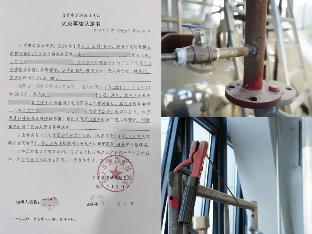 1月3日,自貢市某設(shè)備安裝施工現(xiàn)場發(fā)生火災(zāi),自貢市消防救援支隊依法開展火災(zāi)調(diào)查。經(jīng)調(diào)查,此次火災(zāi)的直接原因為電焊工人蔣某施工前未按照規(guī)定辦理動火審批手續(xù),在電焊作業(yè)過程中未采取安全防范措施,電焊完成后未及時清理現(xiàn)場,致使電焊產(chǎn)生的高溫焊渣透過樓板孔洞掉落至下一層房間頂部塑料材質(zhì)工藝排風(fēng)管,從而引發(fā)火災(zāi)。