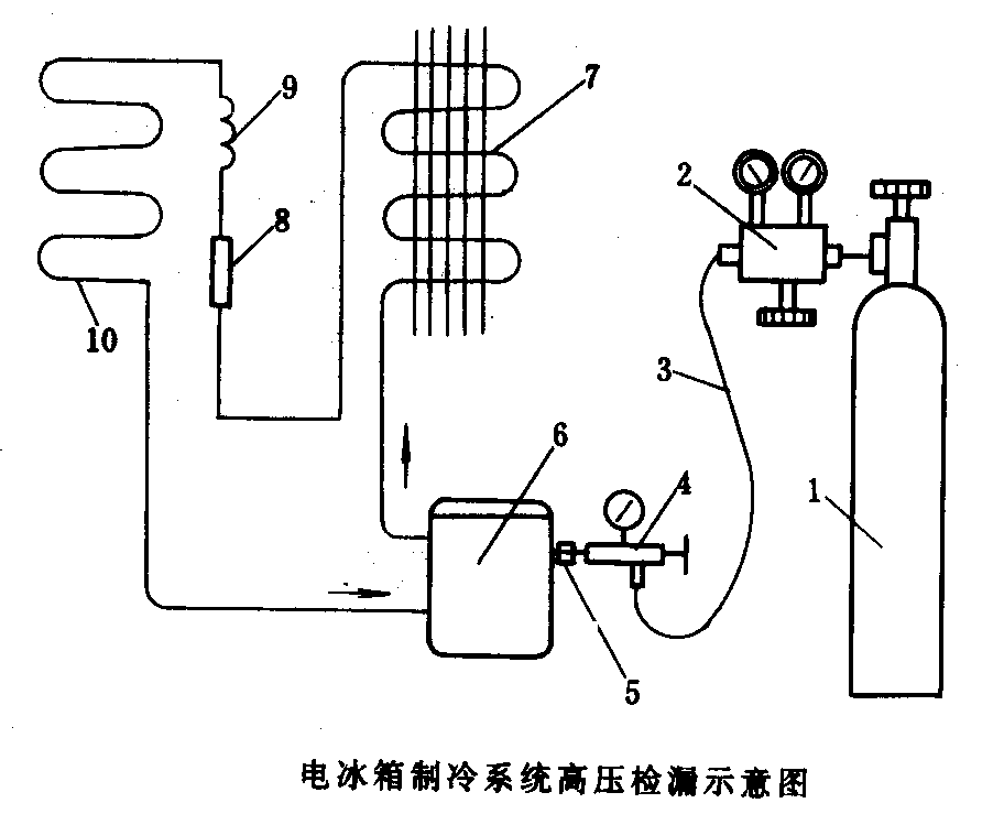 電冰箱制冷系統(tǒng)高壓檢漏示意圖如圖所示。
