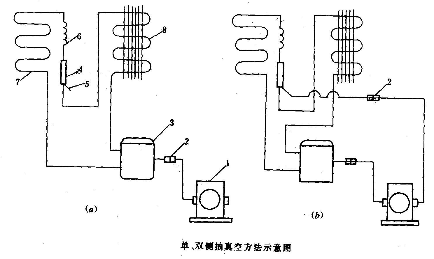 高、低壓雙側(cè)抽真空,能使制冷系統(tǒng)內(nèi)的絕對壓力在l00Pa以下而且可以適當(dāng)縮短抽真空時間。高、低壓雙側(cè)抽真空方法示意如圖 (b)所示。