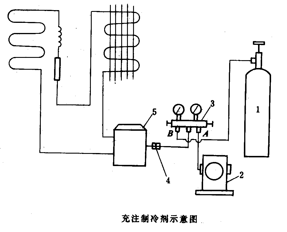 對制冷系統(tǒng)抽真空后,首先關(guān)閉修理閥的A閥門,然后打開制冷劑鋼瓶閥門,再緩慢地打開修理閥的B閥門,制冷劑經(jīng)修理閥進(jìn)入制冷系統(tǒng)。