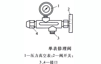單表修理閥是在直通閥上加裝一只壓力真空表而成的。閥體上共有三個接口,一個接壓力真空表,接口4與制冷系統(tǒng)相連接,接口3與真空泵或制冷劑鋼瓶相連接。閥門關(guān)閉時,接口4與壓力真空表仍是相通的,即壓力真空表仍指示系統(tǒng)內(nèi)的壓力。這種修理閥結(jié)構(gòu)簡單,攜帶方便,但連接真空泵與制冷劑鋼瓶的接口在使用時需分別操作,即先接真空泵,抽真空操作結(jié)束后,則旋下抽真空軟管,再接制冷劑鋼瓶軟管,進(jìn)行充灌制冷劑,操作比較麻煩。
